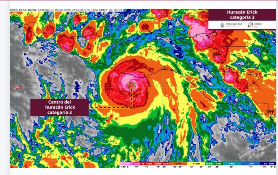Oaxaca de Juárez, Oax. 18 de junio de 2025.- El Consejo Estatal de Protección Civil informa que el huracán «Erick», actualmente de categoría 3 en la escala Saffir-Simpson, continúa desplazándose hacia el noroeste y se localiza aproximadamente a 75 km al sur de Puerto Escondido, Oaxaca; desplazándose hacia el noroeste a una velocidad de 15 kilómetros por hora (km/h).