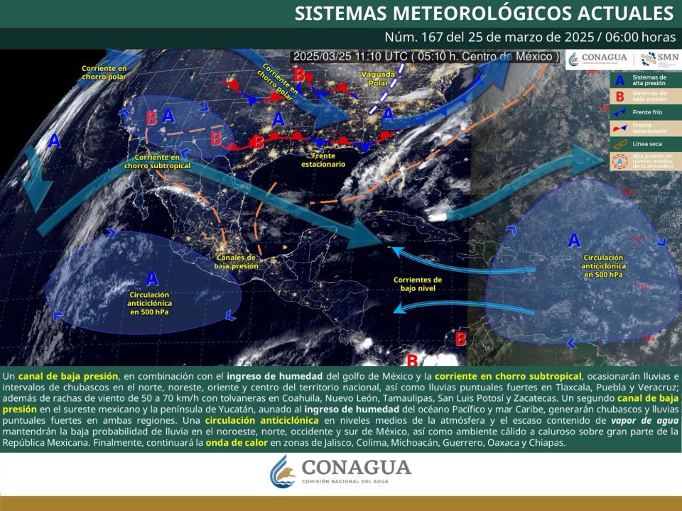 De acuerdo con el pronóstico del tiempo emitido por la Comisión Nacional del Agua (Conagua), la circulación anticiclónica en niveles medios de la troposfera aunado al bajo contenido de vapor de agua, mantendrá baja la probabilidad de lluvias.