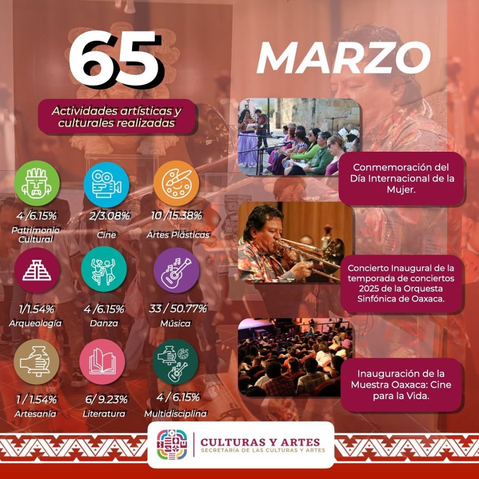 Oaxaca de Juárez, Oax. 26 de marzo de 2025.- El Gobierno de Oaxaca a través de la Secretaría de las Culturas y Artes (Seculta), presentó su informe trimestral de actividades que abarca de enero a marzo de 2025, periodo en el que coordinó la realización de 202 eventos artísticos y culturales para el disfrute de asistentes locales, nacionales y extranjeros.
