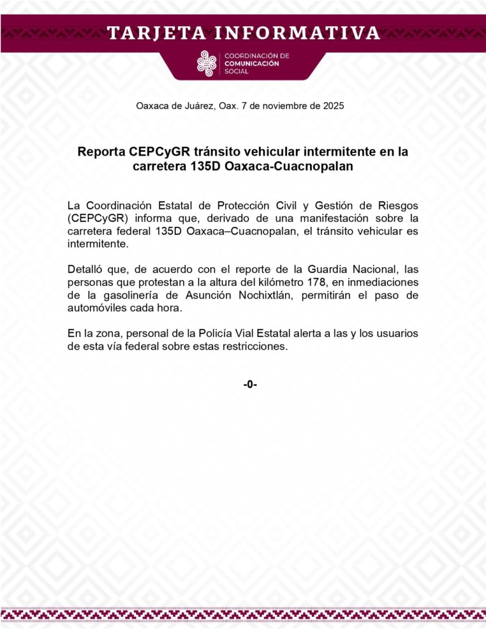 La Coordinación Estatal de Protección Civil y Gestión de Riesgos (CEPCyGR) informa que, derivado de una manifestación sobre la carretera federal 135D Oaxaca–Cuacnopalan, el tránsito vehicular es intermitente.