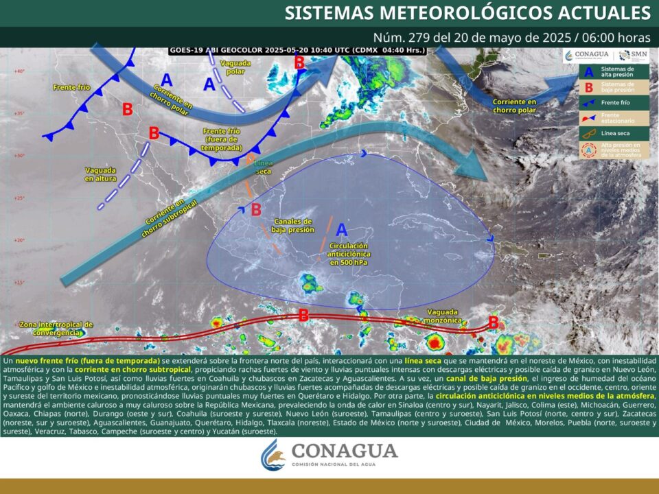 De acuerdo con el pronóstico del tiempo emitido por la Comisión Nacional del Agua (Conagua), por la tarde se prevén probables aumentos de nublados relacionados con chubascos, lluvias y actividad eléctrica aislada con mayor énfasis en zonas montañosas. Los vientos dominantes serán del sur y sureste con algunas ráfagas antes de ocultarse el sol.