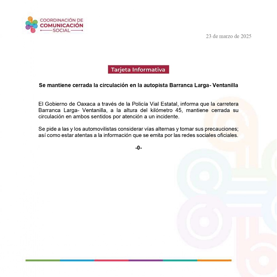 El Gobierno de Oaxaca a través de la Policía Vial Estatal, informa que la carretera Barranca Larga- Ventanilla, a la altura del kilómetro 45, mantiene cerrada su circulación en ambos sentidos por atención a un incidente.