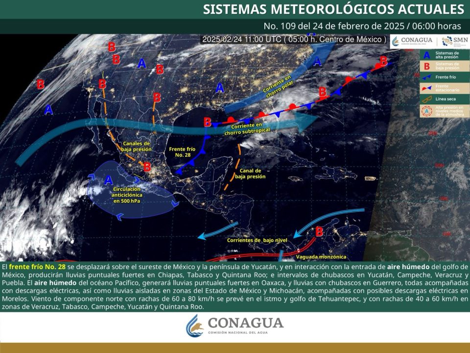 • La probabilidad de lluvias es baja; sin embargo, no se descartan áreas de chubascos y tormentas vespertinas Oaxaca de Juárez, Oax. 24 de febrero de 2025.- La Coordinación Estatal de Protección Civil y Gestión de Riesgos (CEPCyGR) informa que este lunes el frente frío número 28 entrará en disipación sobre el Mar Caribe, por lo que dejará de tener influencia en la República Mexicana. Por otra parte, se establece un sistema de alta presión frente al pacífico sur que permitirá que este día y hasta mitad de la semana se presente un aumento generalizado en la temperatura, con mayor influencia en la Costa, Istmo de Tehuantepec, Sierra Sur y algunos municipios de la Mixteca limítrofes con Guerrero. De acuerdo con el pronóstico del tiempo emitido por la Comisión Nacional del Agua (Conagua), la probabilidad de lluvias es baja; sin embargo, no se descartan áreas de chubascos y tormentas vespertinas, asociadas con ráfagas de viento con polvo y remolinos. Las temperaturas para este día son las siguientes: • Valles Centrales, mínima de 13 y máxima de 30 grados. • Istmo de Tehuantepec, mínima de 23 y máxima de 35 grados. • Cuenca del Papaloapan, mínima de 16 y máxima de 33 grados. • Costa, mínima de 22 y máxima de 35 grados. • Mixteca, mínima de 13 y máxima de 30 grados. • Sierra de Flores Magón, mínima de 15 y máxima de 33 grados. • Sierra de Juárez, mínima de 6 y máxima de 26 grados. • Sierra Sur, mínima de 8 y máxima de 28 grados. Se exhorta a la población atender las recomendaciones de Protección Civil y Capitanías de Puerto, así como a mantenerse informada de las condiciones meteorológicas a través de los medios y redes sociales oficiales. -0-