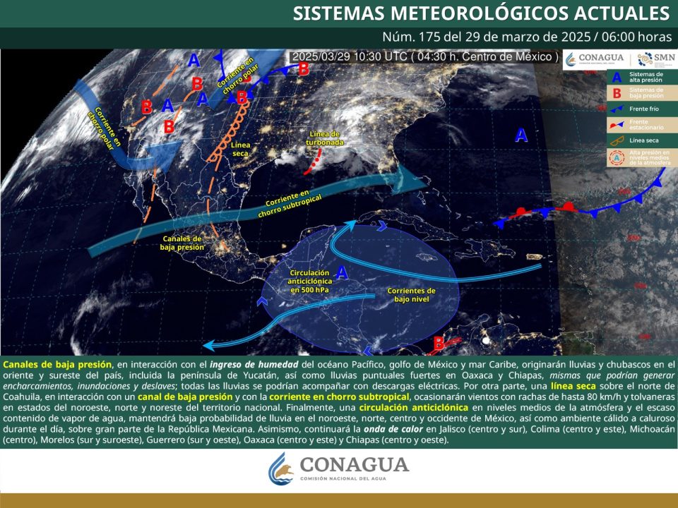 Lo anterior, debido a dos canales de baja presión sobre el centro y sureste del país, apoyados por la entrada de humedad del Océano Pacífico y Golfo de México.