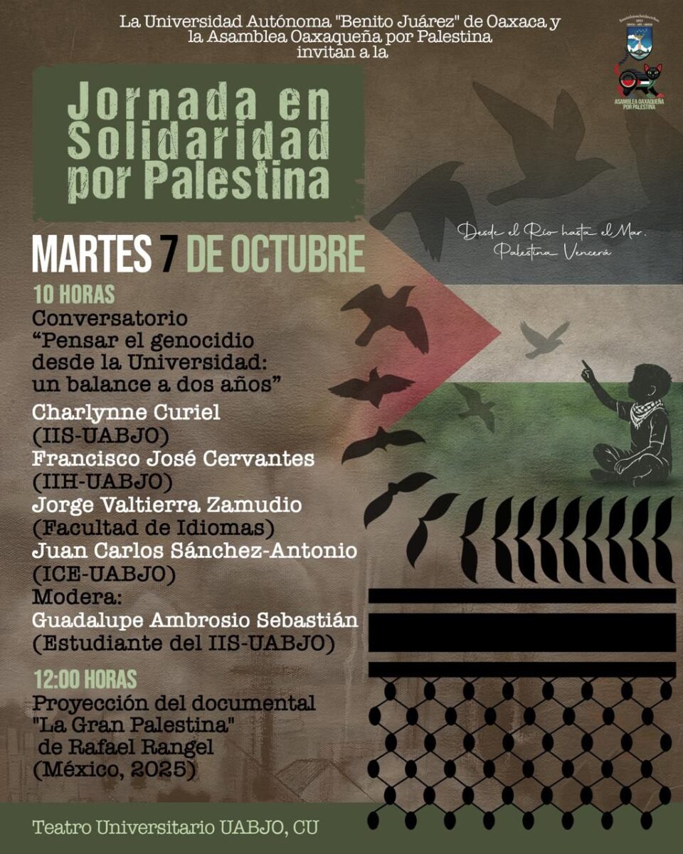 En tanto, que el martes 7 de octubre a las 10 de la mañana se realizará un conversatorio “Pensar en genocidio desde la Universidad” y a las 12:00 horas la proyección “La gran Palestina” de Diego Rangel en el Teatro Universitario, el cual también se presentará ese mismo día a las 19:00 horas en “La Jícara”.